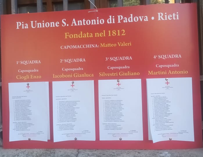 A seguito dell’estrazione effettuata nella Basilica di Sant’Agostino nella tarda serata di sabato 28 giugno, la Pia Unione Sant’Antonio di Padova di Rieti rende noti i nomi dei portatori della macchina del santo per la Processione dei Ceri 2025.